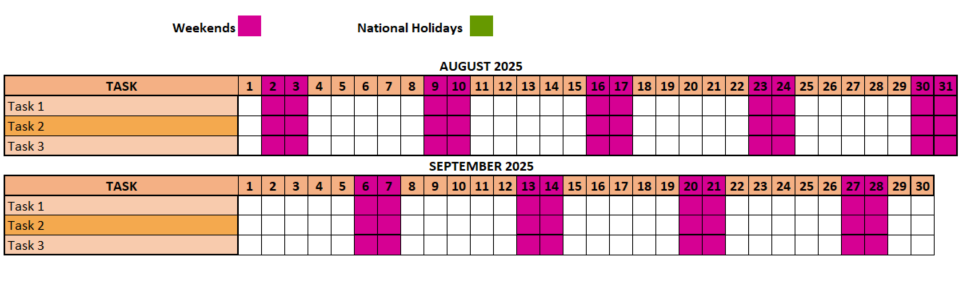 - I always prepare Gantt Charts that would show each month’s activities, as well as national holidays and weekends. This way both HQ and field can plan better.